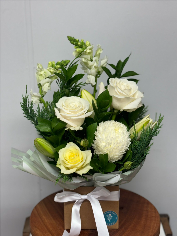 This arrangement is made up of Green and White tones. Flower Variety and style will vary pending on the Season and availability of Flowers.